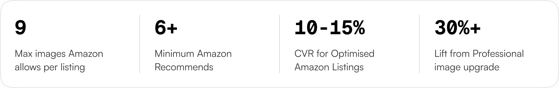 Amazon allows up to 9 images per listing and explicitly recommends a minimum of 6. Yet a significant portion of active ASINs still have 2 or 3 images — leaving conversion-driving slots empty. With Amazon's average conversion rate sitting at 10–15% for optimised listings versus as low as 3–5% for poorly set up ones, what's in your image stack isn't a minor detail. It is often the primary difference.
